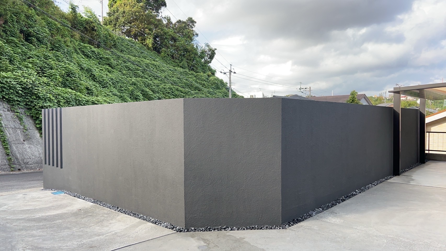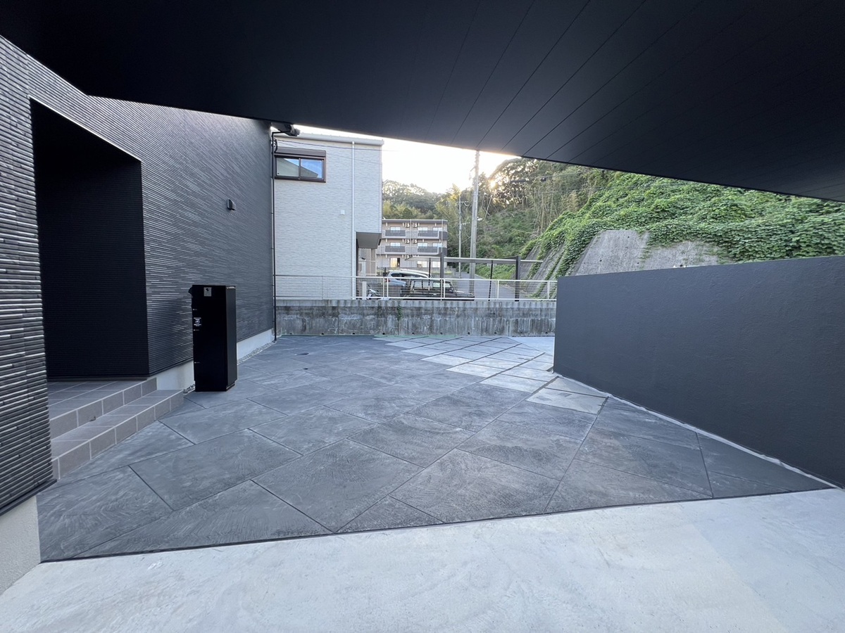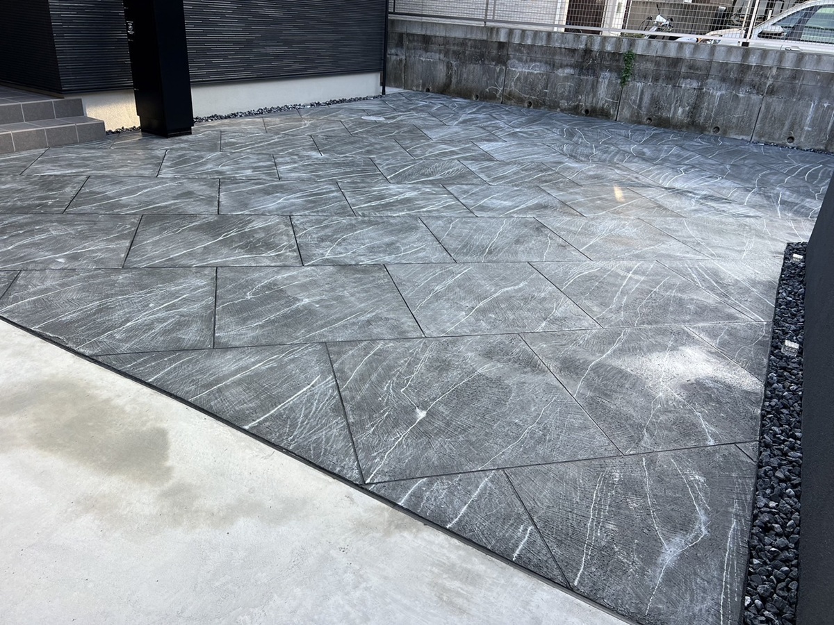 アプローチや駐車スペースにはローラーストーンを施工し、天然石のような高級感ある仕上がりとなりました。